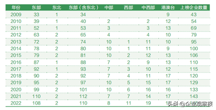 2009年,中国大陆上榜企业34家,分布在北京、广东、河北、吉林、江苏、上海等6个省(市)。2022年,中国大陆上榜企业129家,扩大至21个省(区、市)。其中,东部地区108家,中部地区8家,西部地区11家,东北地区2家。