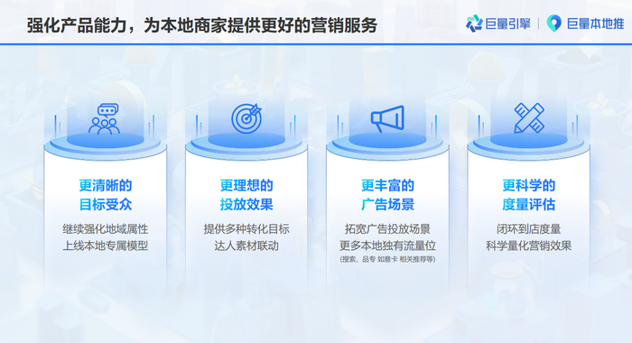 今年,巨量本地推也在贴合生活服务势头猛进的背景下开启产品的强化升级,以构建更清晰的目标受众、更理想的投放效果、更丰富的广告场景、更科学的度量标准“四大能力”为主线,带动商家加速增长。