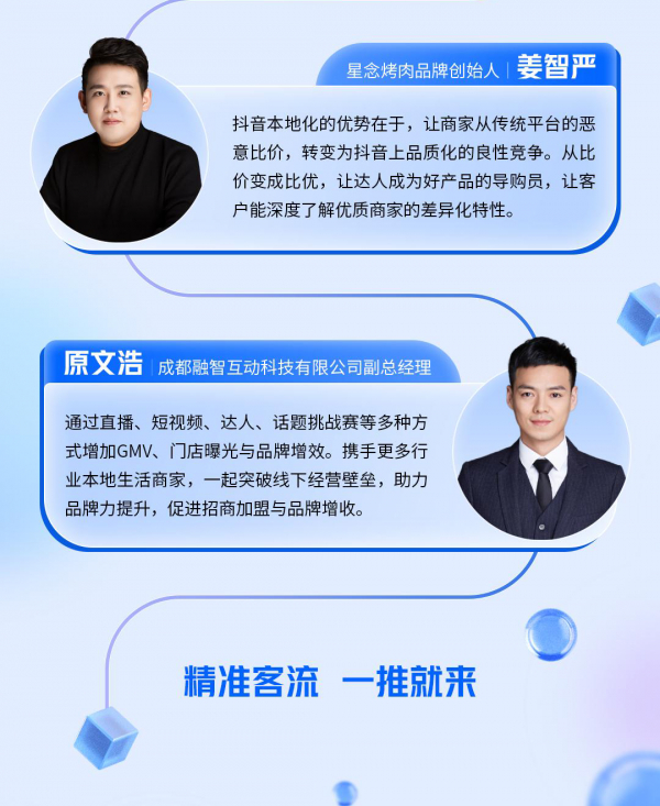作为巨量引擎深度合作伙伴,融智互动通过对巨量本地推的深度使用,已经形成了自己的一套投放思路:了解品牌、梳理人群、衔接调整、分析测试。谈及未来合作展望,成都融智互动科技有限公司副总经理原文浩表示:“希望携手更多本地生活商家,一起突破线下经营壁垒,助力品牌力提升,促进招商加盟与品牌增收。”