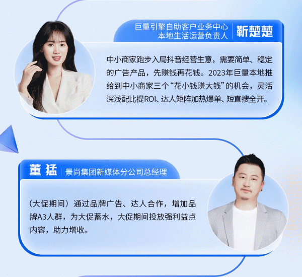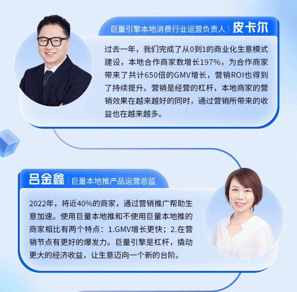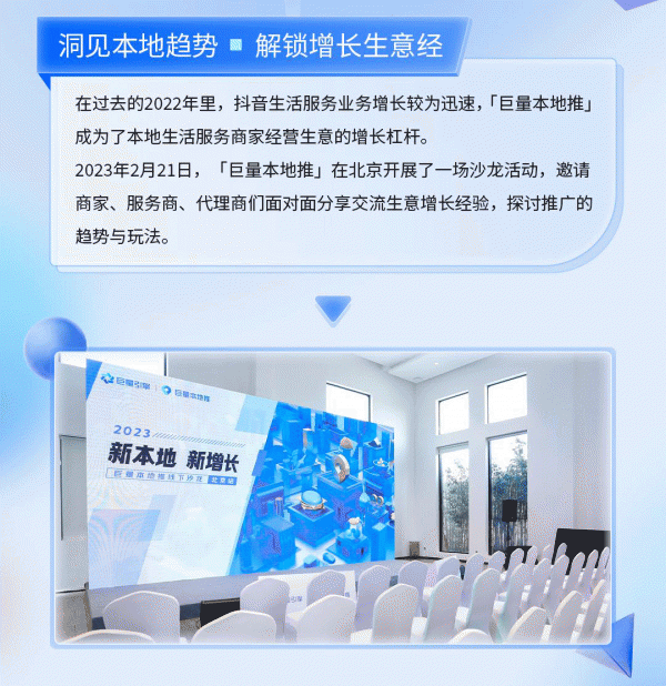 “产品做加法,操作做减法”,巨量本地推还将推出全域推广产品、套餐包类产品,以更贴合商家经营思路的产品和投放逻辑,助力新老商家轻松玩转巨量本地推,为2023生意全局加速。