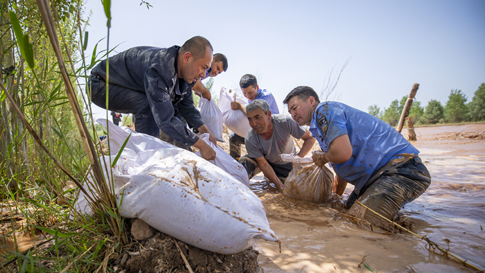 2022年5月25日,天气变暖,克孜河疏勒县洋大曼乡段河水上涨,漫延到阿克亚村村民的农田里,眼看长势喜人的庄稼就要被洪水淹没,村民们赶忙向村警务室求助。