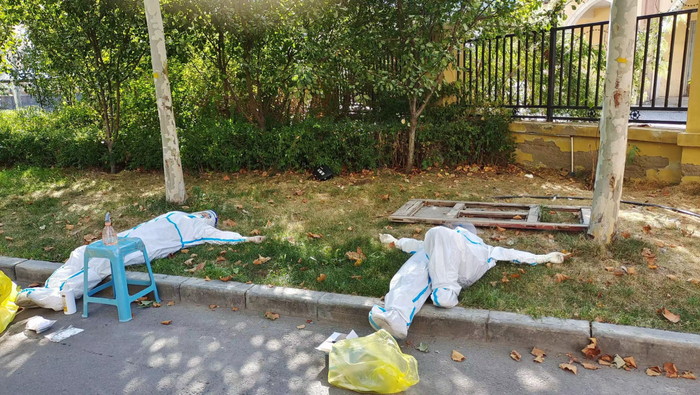 每当看到这个照片就会想起下沉社区,与战友们并肩作战的那段光荣而又辛劳的时光。那段时间,我们严格遵守防疫规定,每天清晨挨家挨户为居民做核酸,累了以天为被,以地为席,于是便有了这张照片。