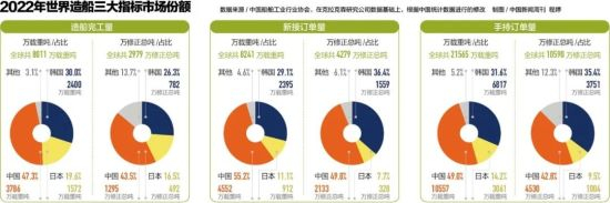 在疫情反复的2022年,中国造船的国际市场份额连续第13年稳居世界第一。从三大造船指标来看,中国的造船完工量、新接订单量、手持订单量以载重吨计分别占世界总量的50%左右,以修正总吨计,则分别占43.5%、49.8%和42.8%,同样保持全球领先。