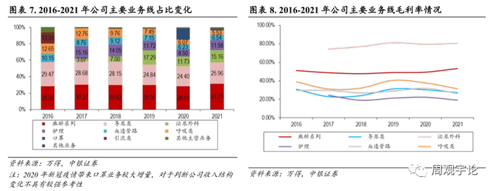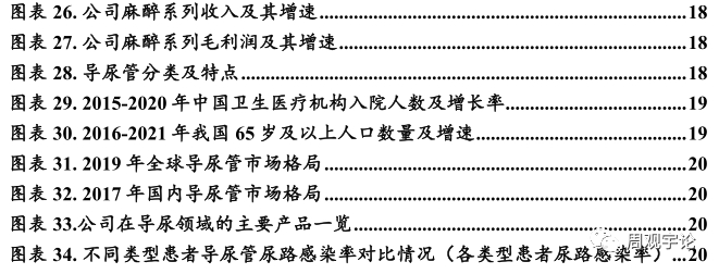 在公司传统领域的导尿产品线, 公司正在大力推广具有较高毛利率的一次性使用导尿包产品。根据公司 2021 年报, 公司重点推广产品超滑导尿包在 2021 年新进医院 171 家。除了传统的导尿业务之外, 公司大力发展毛利率较高的麻醉产品线和泌尿外科产品线。这两条毛利率较高的产品线的占比正在逐渐提升, 且毛利率维持在相对稳定的高位, 与公司传统的导尿类产品维持在 30%左右的毛利率相比, 公司新发力的麻醉业务的毛利率可达 50%左右, 泌尿外科的毛利率可达 80%。