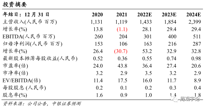 综上,随着公司相应产线重磅产品上市逐步放量,有望带动相应整个产线较为高速增长,同时因为相应重磅产品均具有高毛利率属性,所以公司主要产品线毛利率也有望微增。尤其公司在国内端营销团队的建设以及营销改革有望进一步促进公司产品放量销售的落地,公司预期业绩增长较为确定。同时在海外业务方面深度绑定大客户,定制化项目助力海外增长。公司股权激励彰显管理层信心。我们预计公司2022-2024年业绩呈现较高增速水平,预计收入同比增速分别为28.13%、29.36%、29.38%;毛利率分别为43.60%、44.07%、44.23%。