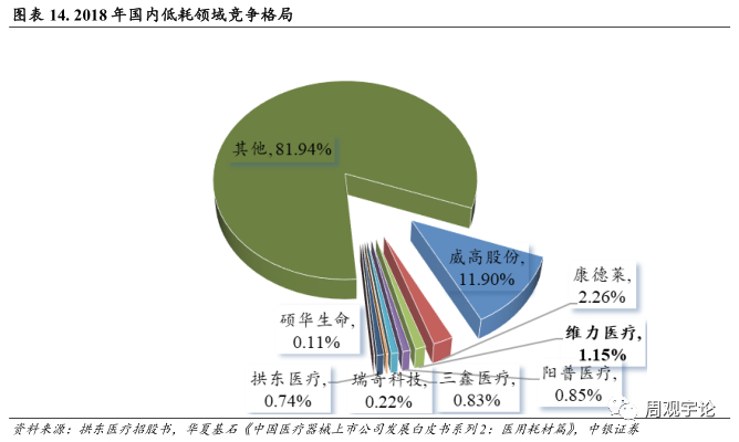 基于低值医疗耗材的广泛应用场景, 我国低值耗材行业规模逐年上行, 目前行业集中度较低, 产品竞争格局分散。根据华夏基石《中国医疗器械上市公司发展白皮书系列 2:医用耗材篇》 统计, 我国低值医用耗材市场格局分散, 威高医疗市场占比超过 10%, 康德莱、 维力医疗的市场份额为2.26%和 1.15%, 其余厂家占比均不到 1%。 我们认为, 随着技术的升级、 医疗需求的提高、 环保政策的趋严、 行业监管的加强以及市场竞争的加剧等因素, 低值医用耗材市场将优胜劣汰, 头部企业凭借其自身产品、 研发及渠道等优势有望更多的抢占市场份额, 从而促使行业集中度逐步提升 。