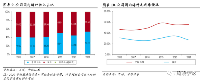 在全球xg疫情往复的背景下, 公司继续深耕国内终端市场, 不断提升公司在国内各细分领域的市场地位。2021 年, 公司中国大陆境内收入在总收入中的占比达到了 53.66%。公司在中国大陆境内市场的毛利率相比于境外市场较高,2021年公司在中国大陆境内市场的毛利率达到55.67%, 而同 时期境外市场的毛利率为27.10% 。