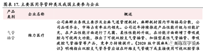 气管插管是现代麻醉与急救医学不可缺少的基础医疗器械, 是通气支持和呼吸治疗的关键器械。气管插管通过口腔或鼻腔插入病人气管内, 可帮助患者建立人工呼吸道, 维系深度麻醉, 保障呼吸道通畅, 满足机体氧的需求与二氧化碳的排出, 广泛应用于全麻手术。喉罩在临床的作用与传统气管插管基本相同, 主要应用于时间较短的手术、 使用气管插管较困难的手术以及短时间内多次诊断性检查等情况中。公司以临床需求为导向, 气管插管、 喉罩等产品均有布局。