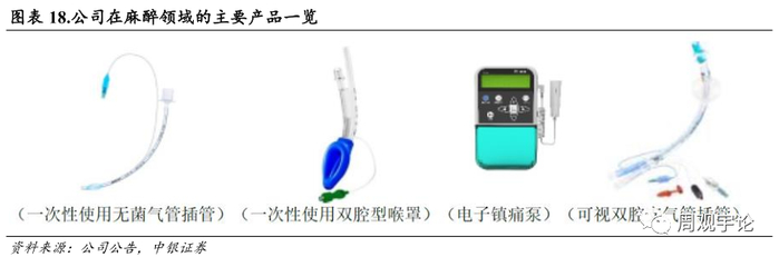 在收购苏州麦德迅获得麦德迅的电子镇痛泵后, 公司在麻醉领域的产品覆盖更为齐全, 目前麻醉领域的产品有一次性使用无菌气管插管、 一次性使用双腔型喉罩、 电子镇痛泵和可视双腔支气管插管、加强型气管插管、 气管切开插管、 支气管插管、 麻醉面罩、 人工鼻、 麻醉呼吸管路等。公司的麻醉产品主要是和麻醉呼吸机相配套使用, 用于急救、 ICU 或麻醉时建立人工通气道。适用于各种吸入全麻手术、 预防和处理呼吸道梗阻、 呼吸功能不全和需要抢救的病人。