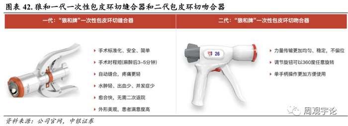公司的包皮环切缝合器属于一次性使用的高毛利率产品, 毛利率可达到 80%, 属国内首创, 市场份额很高, 是国内行业龙头。