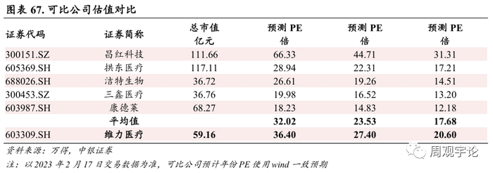 考虑公司产品逐步升级,盈利能力逐步增强,我们选取和公司业务相近的三鑫医疗、低值医疗耗材企业康德莱及高分子医疗塑性耗材企业拱东医疗、洁特生物、昌红科技做估值对比。
