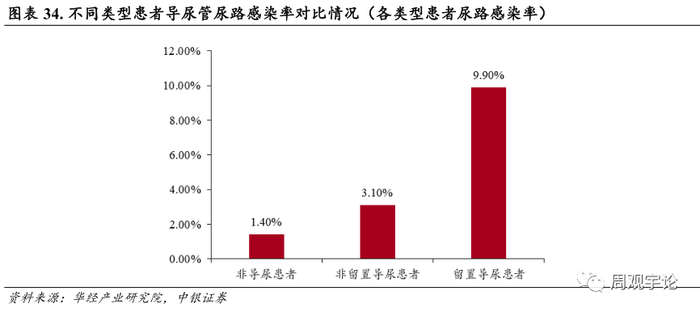 导尿管作为基础临床医疗产品是现在临床手术的必须耗材之一。然而导尿管相关尿路感染(CAUTI)却又会显著增加住院患者的死亡率、 住院费用及住院时间。CAUTI 会使得患者平均住院时间延长,引发不必要的抗菌药物使用。根据华经产业研究院报告显示, 留置导尿患者的尿路感染率约为非留置导尿患者、 非导尿患者的 3 倍以上。