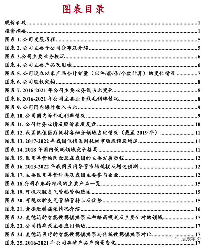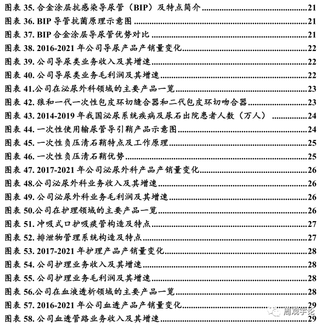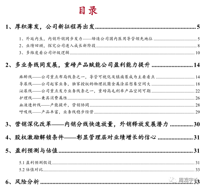 2) 好公司, 医用导管领军企业公司深耕医用导管行业, 持续加大研发投入, 适当产业整合并购, 产品不断丰富, 产品逐步升级。同时公司生产自动化能力不断加强。近年来公司推出可视双腔支气管插管(实现插管可视化, 拥有一定的技术壁垒) 、 负压清石鞘等创新产品, 截止 2022 年上半年度又有 5 个新产品(一次性使用可视双腔支气管插管套件、 亲水涂层聚氯乙烯导尿管套件、 亲水涂层硅胶导尿管套件、 一次性使用热湿交换过滤器套件、 一次性使用泌尿道用导丝) 获得医疗器械注册证。目前, 公司在各细分领域均实现技术领先, 持续提高品 牌影响力和产品终端销售。独家代理的 Bactiguard AB BIP 导尿管国 内三类证延续获批后进一步巩固公司该领域竞争优势(截至目前为止, BIP 导尿管为国内唯一获得三类医疗器械注册证的抗菌导尿管) 。且公司持续研发投入, 新创新管线丰富, 创新产品升级换代且不断丰富, 有望驱动公司业绩持续快速增长。另外, 2021 年底, 公司收购苏州麦德迅51.4743%股权, 其成为公司控股子公司, 继续丰富了公司麻醉领域产品结构, 2022 年中报并表。生产方面, 公司持续进行生产自动化升级和改造。截止 2022 年中报, 公司投入使用的自动化项目有阀气泡线组装设备、 单向阀组装设备、 乳胶导尿管装配线、 雾化罐组装机、 杨克打包机、 插管打包机、 单向阀自动检测机、 注射硫化自动取模和插针等共计 13 项, 进一步提升了生产效率和产品质量稳定性。新投入建设的自动化项目共 10 项, 包括杨克把手自动取放、 雾化面罩自动组装线、儿童型导尿管成型设备、 硅胶导尿管组装设备、 硅胶导尿套自动成型设备等项目。内销方面, 公司进行的营销改革能实现更多产品的放量。 公司进行营销改革, 结合公司重磅产品的产品竞争力, 增加学术推广活动数量, 推动新入院数量的增长, 利用重磅产品进入新医院后, 可以带动公司的其他产品的销售, 进而实现境内市场销售的进一步增长。同时, 公司原本采取一个营销团队负责多条业务线的形式进行营销, 难以实现销售的专业化。近年来公司逐步改革内销营销模式,采用不同的营销队伍负责不同的产品的模式分线销售, 并注重对销售人员的培训和考核, 营销团队的专业性有所提升。外销方面, 绑定大客户并规划提前布局。 公司利用技术产能优势积极争取大客户的非标定制产品项目, 为海外 大客户提供整体解决方案, 目前 多个项目处于技术研发阶段, 后面有望陆续商业落地贡献业绩。同时, 公司计划进一步增加对于海外市场营销的提前布局, 选取重点地区新建海外本土化营销团队, 如在欧洲设立销售子公司等, 加大新客户的开发及新产品的终端推广力度, 进一步改善同海外大客户或经销商的关系, 提高沟通效率, 为海外大客户提供整体解决方案。股权激励表明管理层对于业绩增长有信心。按照公司于 2021 年进行的股权激励解锁行权条件来计算, 100%解锁条件为 2022-2024 年扣非归母净利累计不低于 1.56、 3.58、 6.20 亿元。综上, 公司主要产品属于手术用耗材, 产品在临床上广泛应用于手术、 治疗、 急救和护理等医疗领域。短期看, 2023 年 1 月份以来, 近两年受疫情影响的可择期手术预期逐步恢复, 手术用耗材需求亦将随之增长。 长远来看, 随着现代科技发展、 世界人口平均寿命不断增加和老龄化趋势加剧,手术、 治疗、 急救和护理等医疗领域医疗耗材需求不减。目前来公司产品所在细分市场竞争比较分散, 公司市场占有率仍有较大的提升空间。内销方面, 公司基于各产品线产品特点与市场渠道的差异性, 2020 年开始整合市场渠道和销售人员, 2021 年实现国内营销分线销售。根据公司 2022 年中报显示, 公司产品已有效覆盖全国所有省区, 产品进入国内超过 4,000 家医院, 其中三甲医院1,000 家以上。随着新医改政策落实、 医械国产替代化进程加快, 公司产品力进一步提升等多因素驱动下, 预计公司产品市场占有率将进一步提升。外销方面。公司深度绑定核心大客户, 公司利用技术产能优势积极争取大客户的非标定制产品项目,为海外大客户提供整体解决方案。股权激励解锁条件的业绩高增长更是彰显公司管理层经营信心。我们从短中长期三个时间维度分析了公司增长趋势, 看好公司价值。