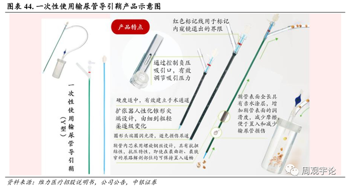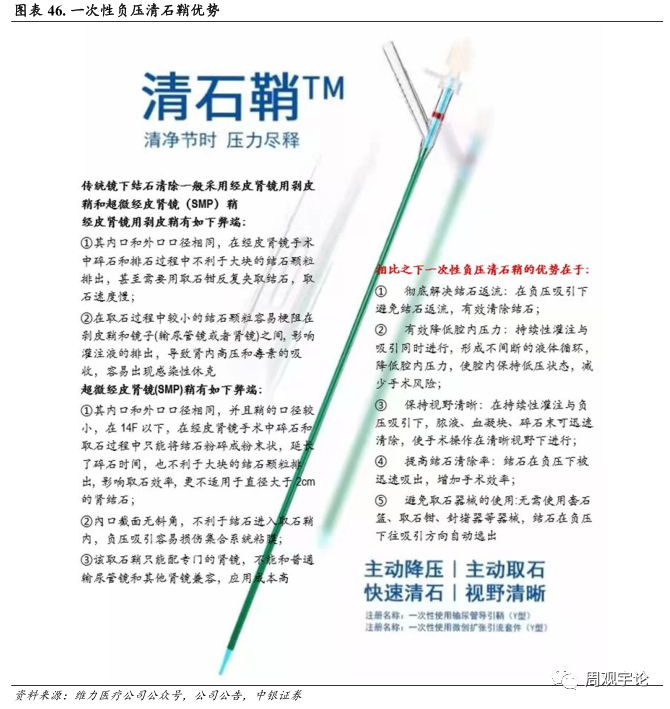 公司在泌尿外科领域, 推出了负压清石鞘创新产品, 产品采用负压取石方式, 提高了清石效率及患者安全性。传统产品的清石鞘是直型, 公司的负压清石鞘创新产品采用 Y 型, 可以通过负压原理把碎掉的结石和血雾吸出。同时, 负压清石鞘可以同时灌注与负压吸引, 借此平衡人体内部的压力,降低手术的风险。持续的灌注和负压吸引又可以使得手术视野更为清晰, 提高手术的效率。