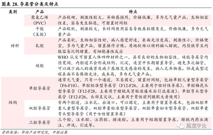 导尿管是一种被广泛用于临床医疗的基础医疗器械, 且在人口老龄化不断加深的背景下, 在将来有望能进一步扩大市场规模。导尿管包括临时导尿管(单腔) 和留置导尿管(双腔型、 三腔型可用于膀胱冲洗) , 材质有聚氯乙烯、 乳胶、 硅胶等, 其中留置乳胶导尿管弹性好、 柔软舒适、 永久变形率低、 价格经济, 但可能存在患者对乳胶原料中蛋白质成份过敏的现象, 相比之下留置硅胶导尿管的生物相容性、 舒适性、 适应性更佳, 更适合中长期留置使用, 但单价相对较高。