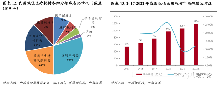 低值医用耗材行业:门槛低, 竞争充分, 市场格局分散。是临床多学科普遍应用的一次性医用材料,市场化程度相对较高。 与医疗器械行业的其他领域相比, 低值医用耗材的种类繁多, 参与的企业数量较多, 市场竞争较为充分。根据中国医疗器械蓝皮书(2019 版),注射穿刺类在低值医用耗材市场占比最大,市场份额高达30%,其次为医用卫生材料及敷料类,市场份额达22%。