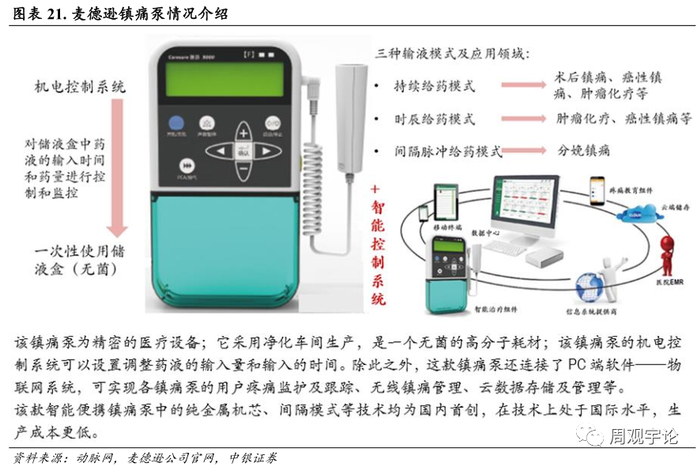 2021 年公司完成对苏州麦德迅的收购, 麦德迅成为公司的控股子公司。麦德逊自 2014 年创立开始就进入疼痛输注领域并开始在智能便携镇痛泵上的探索。麦德迅智能便携镇痛泵为公司的明星产品。该镇痛泵属于三类医疗器械, 处于医疗器械里面最高级的监管模式。麦德迅医疗目前已与国内多家著名医疗机构的资深专家达成了合作。除此之外, 公司依托于东南大学苏州医疗器械研究院雄厚的学科基础和技术成果, 已建设麻醉科、 ICU 领域的创新医疗器械技术产业化平台, 产品覆盖了疼痛管理线、 输注管理线、 可视化气道管理线等三大领域, 可广泛应用于麻醉科、 ICU、 儿科、 急诊、肿瘤科等科室。