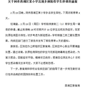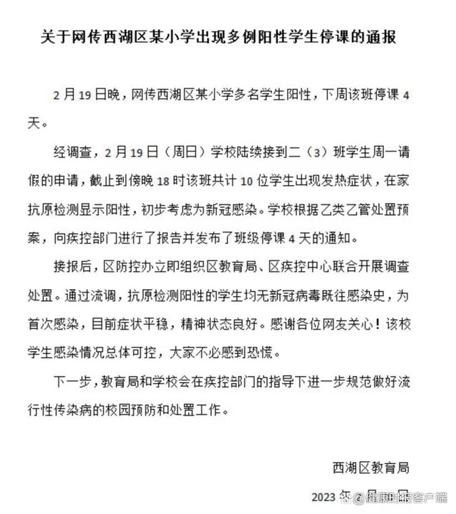 2月20日,据浙江省杭州市西湖区教育局通报,截至2月19日18时,西湖区某小学二(3)班共有10位学生出现发热症状,抗原检测阳性,初步考虑为新冠感染。学校根据“乙类乙管”处置预案,发布班级停课4天的通知。