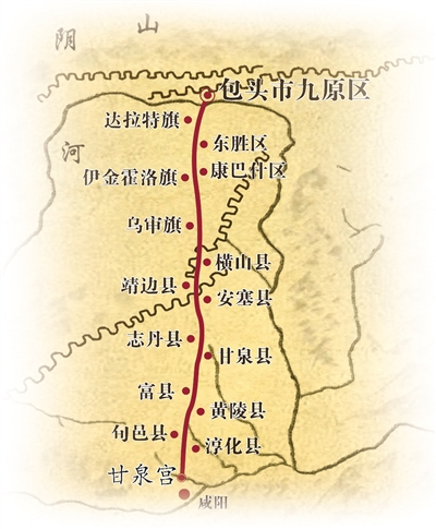 “道九原,直抵甘泉,乃使蒙恬通道。自九原抵甘泉,堑山堙谷,千八百里。”这是《史记·蒙恬列传》中对秦直道简略的记载。