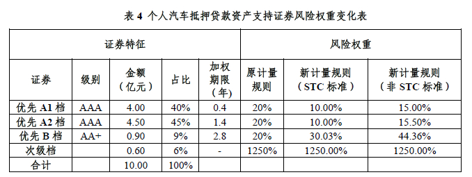 结合个人汽车抵押贷款、个人住房抵押贷款、个人消费贷款、微小企业贷款等四类常见基础资产的特点,参考主流产品设定相关信贷ABS的证券分层及期限特征,我们测算分析了新旧规则下风险权重的变化情况。