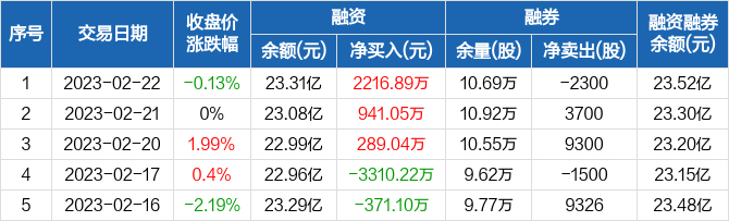 融资方面,当日融资买入9653.69万元,融资偿还7436.8万元,融资净买入2216.89万元,连续3日净买入累计3446.97万元。融券方面,融券卖出2.53万股,融券偿还2.76万股,融券余量10.69万股,融券余额2148.83万元。融资融券余额合计23.52亿元。