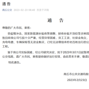 2月23日,河南商丘市公共交通有限公司微信公众号“商丘公交”发布通告: