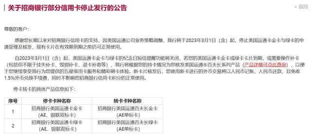 招商银行公告显示, 2023年3月1日(含)起,停止美国运通卡金卡(AE、银联双标卡)与绿卡(AE、银联双标卡)的申请受理及核发, 现有卡片在有效期到期之前仍可正常使用。