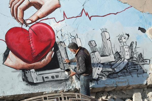 叙利亚艺术家在地震废墟上画画 绘出缅怀与希望