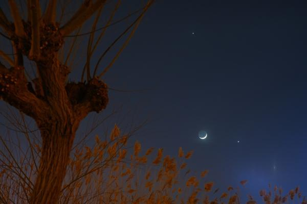 2月22日,世界多地夜空上演“金星伴月”——明亮的金星与极细的月牙近距离相伴,同时木星就在它们附近,两颗亮星一近一远“护航”在“月亮”旁边。