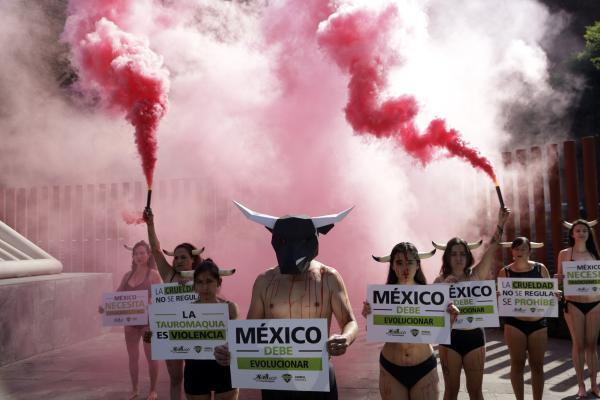 2月21日,墨西哥墨西哥城,众议院外,“动物英雄”组织参加反对斗牛的示威活动。
