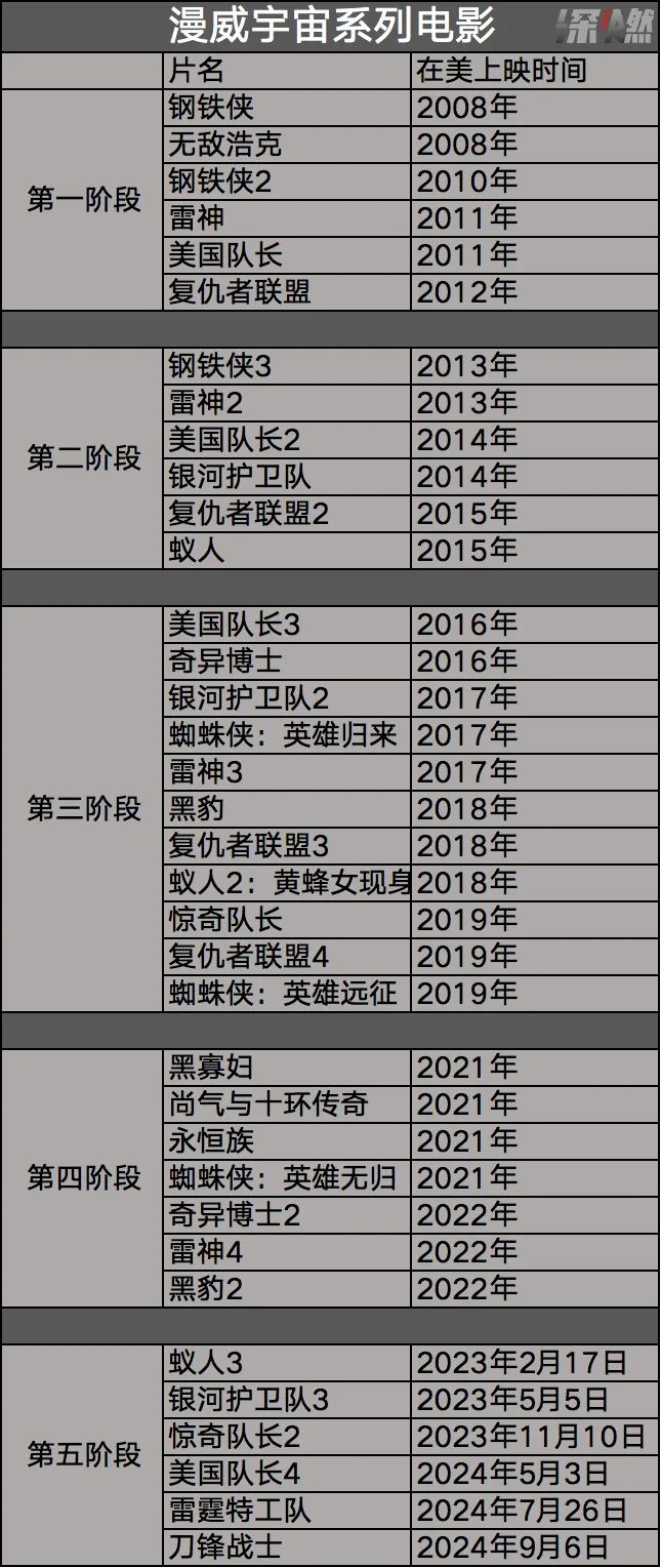 漫威宇宙目前被分为了6个不同阶段,《复联4》为前三个阶段画上圆满句号,到了第四阶段,新片除《黑豹2》外,都缺席了中国市场,同时,过度依赖视效和俗套的超级英雄故事模板,这一阶段的影片内容质量,也都乏善可陈。