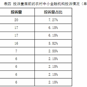 包头农村商业银行、呼和浩特市如意蒙银村镇银行、土默特左旗农村信用合作联社、呼和浩特金谷农村商业银行、和林格尔县农村信用合作联社投诉量位列农村中小金融机构前五名。其中,投诉量居前的农村中小金融机构为:包头农村商业银行20件,占农村中小金融机构投诉总量(下同)的7.27%;呼和浩特市如意蒙银村镇银行、土默特左旗农村信用合作联社各17件,占比6.18%;呼和浩特金谷农村商业银行16件,占比5.82%;和林格尔县农村信用合作联社7件,占比2.55%;科尔沁区农村信用合作联社、开鲁农村商业银行、敖汉农村商业银行、宁城农村商业银行各6件,占比均为2.18%。