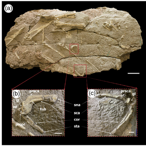 此次,科研团队通过对新疆哈密早白垩世的湖相地层产出的哈密翼龙肩带进行研究发现,哈密翼龙的喙上肌如同鸟类一样绕行顶乌喙突内侧连接肱骨近端,顶乌喙突可能实现类似的滑轮功能,说明翼龙可能如鸟类一样利用喙上肌收缩实现翅膀上扬。研究还发现,哈密翼龙的肩臼窝疑似保留有软骨组织,表明翼龙的肩臼窝可能与鸟类一样具有厚实的关节软骨以缓冲飞行压力。