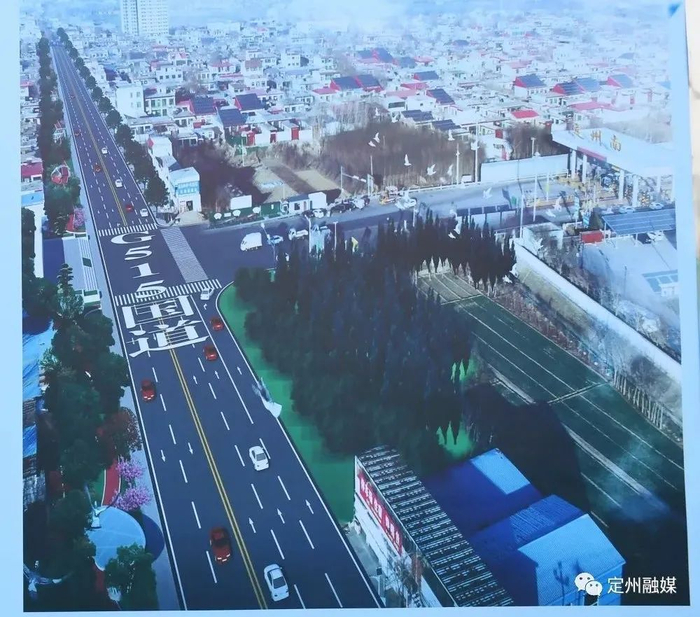 该项目线路全长1300米,现状道路宽11米,拟在现有道路基础上拓宽两个车道,由双向2车道改为双向4车道,道路西侧设1米宽盖板排水沟,排水沟西侧设计6—8米带状游园,打造沿街景观带,在高速口向南道路东侧加宽一条右转专用车道。沿街立面整体提升改造,统一标识和墙体色调,沿线安装路灯照明。