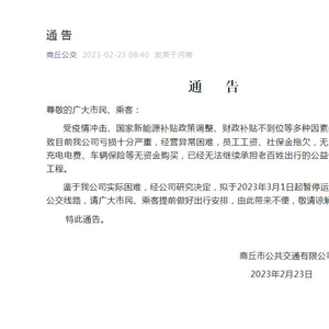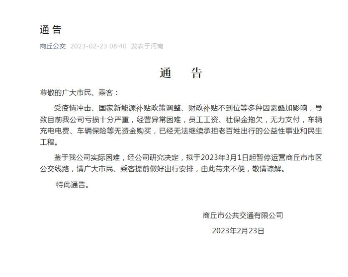 2月23日上午,商丘市公共交通有限公司在官方公众号“商丘公交”发布通告称,受疫情冲击、国家新能源补贴政策调整、财政补贴不到位等多种因素叠加影响,导致目前该公司亏损十分严重,经营异常困难,员工工资、社保金拖欠,无力支付,车辆充电电费、车辆保险等无资金购买,已经无法继续承担老百姓出行的公益性事业和民生工程。