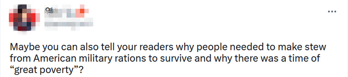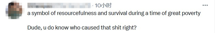 还有一名韩国网民指出,这道看起来令人垂涎欲滴的菜肴,实则是美军“新殖民主义”的象征,“这就像称赞正在做三份工作的老人有生存智慧,却不是哀叹他们不得不这样生活是一个多么可怕的耻辱。”
