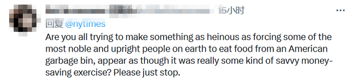 “难道你们都想强迫人们吃美国垃圾桶里的食物,这样令人发指的事情吗?求你别说了。”