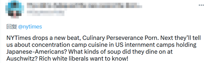 看到美媒美滋滋地宣传这道菜,不少人感到愤怒:“简直是一派胡言,这只会让我想起朝鲜战争”“下一步你们是不是要给我们介绍以前日裔美国人在集中营里吃什么了?富有的白人自由主义者想知道!”