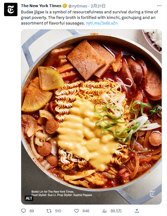 21日,美媒《纽约时报》发布了一则由韩裔美国人撰写的“韩式部队锅”食谱,其中介绍称这道菜起源于朝鲜战争,最早是用“美国陆军剩余的口粮”制成。评论区中很快有一群网民提出批评,认为美媒宣传这道菜是在显示其种族主义和帝国主义。