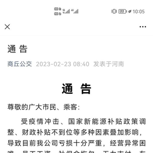 2月23日,商丘市公共交通有限公司发布通告,受疫情冲击、国家新能源补贴政策调整财政补贴不到位等多种因素叠加影响,导致目前商丘公交公司亏损十分严重,经营异常困难,员工工资、社保金拖欠,无力支付,车辆充电电费、车辆保险等无资金购买,已经无法继续承担老百姓出行的公益性事业和民生工程。