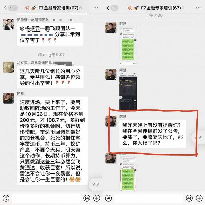 他相信群聊中那些“乐观”的发言,“不要相信公告”“外部传闻都是假的。情况还不明朗,操盘团队也没有跑路”。阿慧信誓旦旦的话也让他有底,雷达币会在2023年11月25日会涨到5000,“输了赔人家500套别墅”。