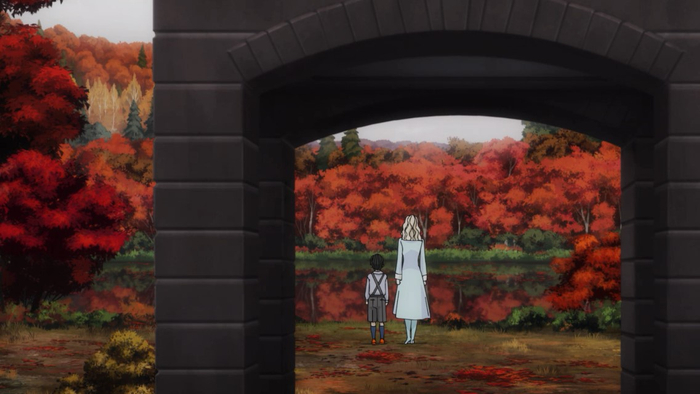 其实这种篇章排布,还是有比较明确的设计。因为伊藤润二画的都是短篇,内容长短不一,为了统一成动画制作,剧集选择了一集“一个故事”与“两个故事”这种长度。在第6集中,《霉》为了体现一栋房子被霉菌占据的感觉,特意只以黑白两色来制作动画。《藏书幻影》的主题是一种类似“司汤达综合症”的心理疾病,是面对过于庞大的艺术作品而感受到的压力,甚至引发了人的精神崩溃。为了强化这种感受,动画特意把美景的色彩弄得相当有油画的艺术氛围。一暗一明两个故事放在同一集中,也通过对比更强化了伊藤润二的世界之丰富。