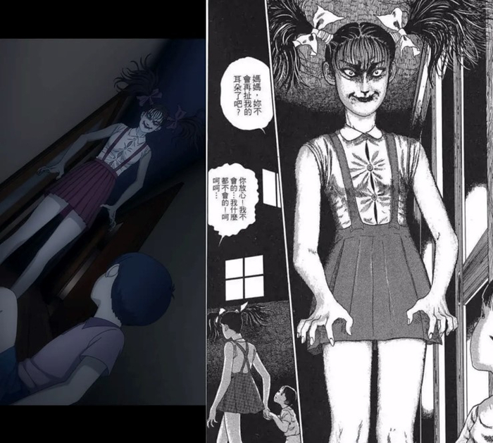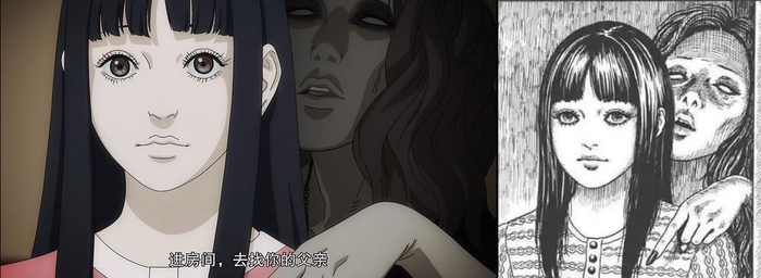 整体来看这部动画谈不上让人大失所望,阴冷诡异的氛围和作画效果基本都在努力靠近原作,还原度很好。只是不少关键地方,可能过于中规中矩而差一口气。这“一口气”,对于不少伊藤润二的漫画迷来说,通过对比就可以看出动画和原作的功力差别——前者相对正常,后者的描绘就属于“骇人”了,仅仅看画也能明白两者之间的氛围差异。伊藤润二成熟后的漫画作品,“画”的质量越来越高,也并非所有动画导演和画师想模仿就能模仿到位的。