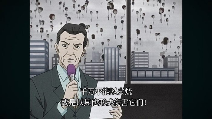 对于整部剧集来说,第一个能让人印象深刻的故事,大约是第三集《人头气球》了。这是个长度适中的短篇,描写天空中莫名漂浮着巨大的人头气球,威胁着普通人的生命。故事不断通过主人公现在的恐惧状态和回忆做穿插,虽然短小,结构还是做了一些有变化的处理——相对来说有的短篇更缺乏完整的线索变化,只是有悬念,然后在“吓人”的氛围中就很快结束了。动画特意选择以4:3的画面和质感来塑造新闻报导的感觉,强化了整个世界越来越被“人头气球”占据的诡异氛围。
