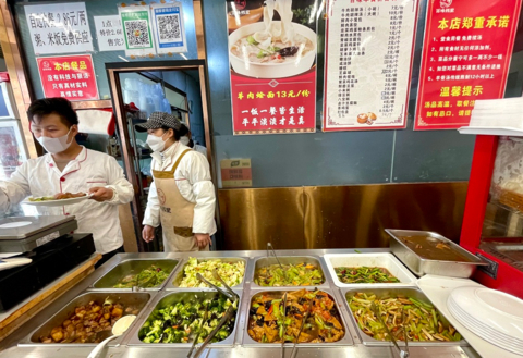 同样是中午,位于小营北路附近的百味邻里社区食堂顾客盈门。与大多数餐馆不同,这里提供的是自选快餐,多款菜品荤素搭配,可按需夹取,按照每两2.86元的价格称重收费,粥和米饭免费供应。