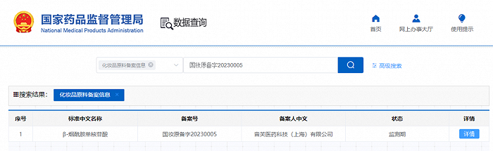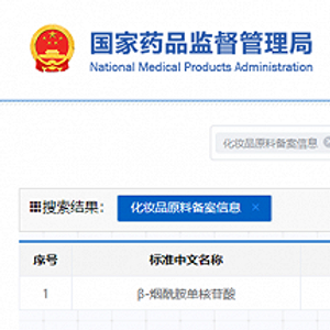 近日,记者发现,在2022年已被3家企业分别完成4次备案的新原料“β-烟酰胺单核苷酸”(NMN),又增加了一条新的备案信息。第4家备案该原料的企业为音芙医药科技(上海)有限公司,原料备案号为国妆原备字20230005,目前原料处于监测期,相关技术要求尚未披露,这也是今年完成备案的第五款新原料。