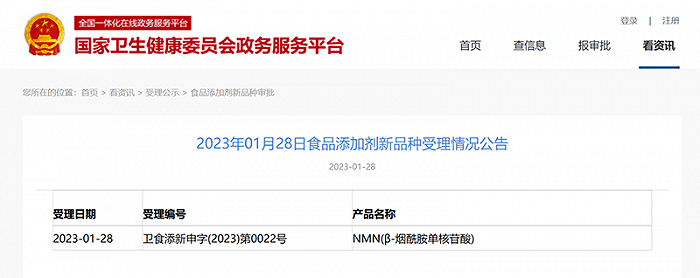 然而近日,NMN在国内的政策出现了松绑的痕迹。国家卫生健康委员会政务服务平台于2023年1月28日发布的发布的食品添加剂新品种受理情况公告中出现了“β-烟酰胺单核苷酸”(NMN),如果受理通过,则意味着NMN的安全性和功效得到了认可。