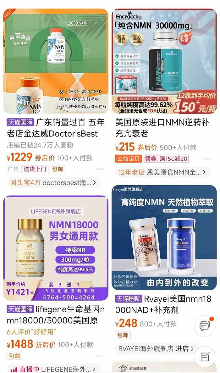 目前在网络平台销售的含NMN的保健品均为海外品牌,售价从数百到上千不等。艾媒咨询数据显示,NMN成分的保健品近年来在国内市场销售不断增长,预计2023年后将以近70.25%的增速攀升至270.13亿元。