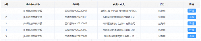 根据药监局官网显示,一年左右的时间内,已经有4家企业先后5次完成对NMN新原料的备案。除上文中提到今年刚刚完成的这次备案以外,2022年该款原料已被先后备案4次。