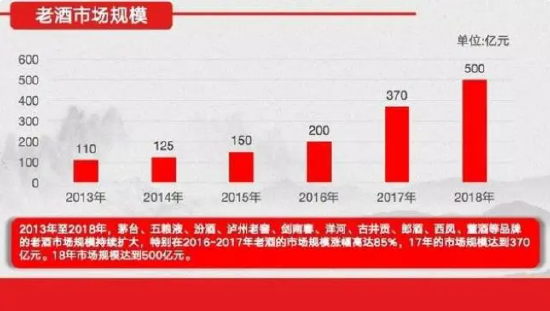 “酱香之上,唯有老酒”,老酒市场逐渐成为行业最大的风口。2013年至2018年,茅台、五粮液、汾酒、泸州老窖、剑南春、洋河、古井贡、郎酒、西凤、董酒等品牌的老酒市场规模持续扩大,特别在2016-2017年老酒的市场规模涨幅高达85%,2017年的市场规模达到370亿元,2018年达到500亿元。近几年,相比于同期白酒市场的整体表现,陈年白酒板块增速也明显领先。